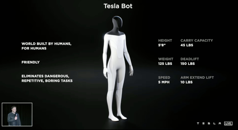 El próximo Tesla Bot, como lo llamó Musk, está diseñado para realizar tareas peligrosas, repetitivas y aburridas para los seres humanos. Es capaz de correr a una velocidad de 8 kilómetros por hora y tiene un peso de 56 kilogramos. Se espera que el primer prototipo se estrene en algún momento del próximo año.
