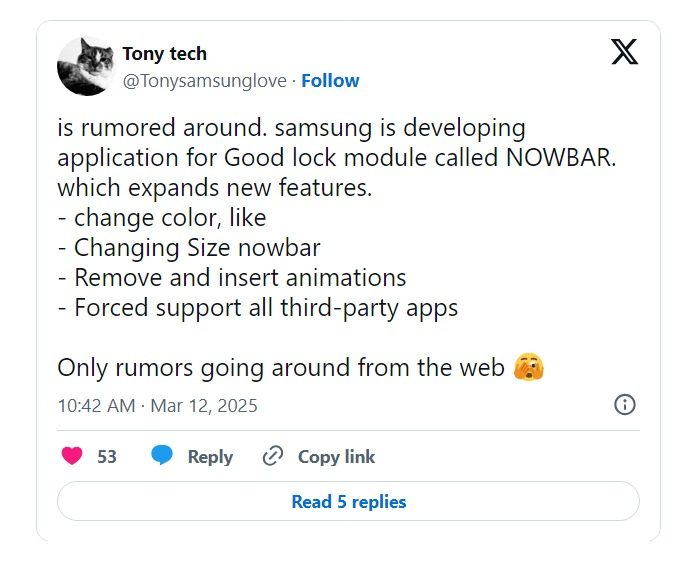 Samsung está desarrollando un nuevo módulo Good Lock que permitirá a los usuarios personalizar la Now Bar. El módulo permitirá a los usuarios cambiar varias características, como el color, el tamaño y las animaciones.