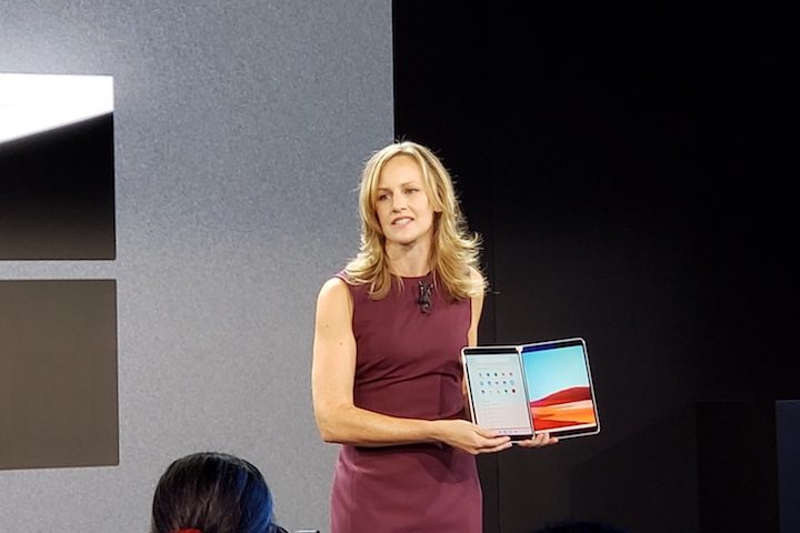 Cuando ya algunos comenzaban a ponerse de pie, llegó la verdadera guinda del pastel: el Surface Duo, el teléfono “plegable” con dos pantallas de Microsoft. ¿Sí? ¿Un celular Microsoft? Panay precisó al momento: Comunication Device, que ya lo de smartphone y celular comienza a sonar prehistórico. Una versión en miniatura del Surface Neo con aplicaciones de Android y que, de paso, parece zanjar ese dolor de callos en que se ha convertido eso de las pantallas plegables: directamente, dos pantallas separadas que se abren y cierran como un pequeño libro, que promete todo lo bueno del mundo del laptop (ejem… Surface) y el mundo de los teléfonos inteligentes en un solo dispositivo.