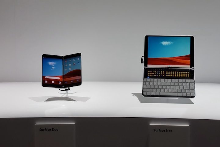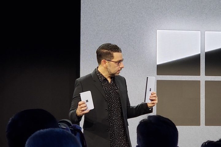 Cuando ya algunos comenzaban a ponerse de pie, llegó la verdadera guinda del pastel: el Surface Duo, el teléfono “plegable” con dos pantallas de Microsoft. ¿Sí? ¿Un celular Microsoft? Panay precisó al momento: Comunication Device, que ya lo de smartphone y celular comienza a sonar prehistórico. Una versión en miniatura del Surface Neo con aplicaciones de Android y que, de paso, parece zanjar ese dolor de callos en que se ha convertido eso de las pantallas plegables: directamente, dos pantallas separadas que se abren y cierran como un pequeño libro, que promete todo lo bueno del mundo del laptop (ejem… Surface) y el mundo de los teléfonos inteligentes en un solo dispositivo.