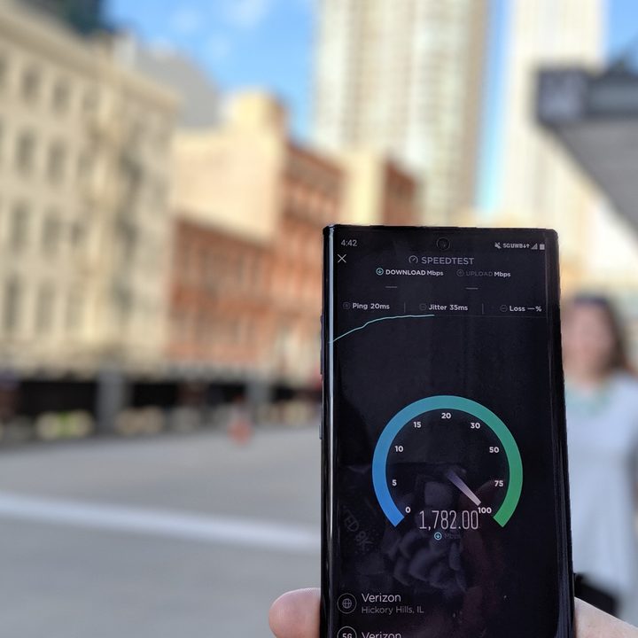Junto a un representante de Verizon, caminé por las calles de Chicago, Illinois, buscando nodos que ofrecieran la red 5G. La operadora tiene una decena de ellos en varios puntos estratégicos del centro. Armados con dos Samsung Galaxy Note 10 Plus 5G, pudimos probar su velocidad. Y la verdad es que los tiempos fueron sorprendentes.