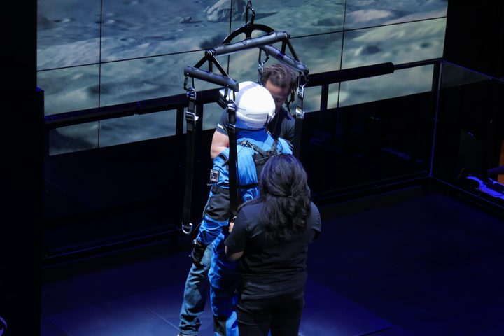 Con la ayuda de dos personas, nos pusimos un traje de vuelo diseñado con la ayuda de la NASA. Se siente bastante apretado, y hay sensores en el traje para ayudar a rastrear los movimientos en la realidad virtual. Lo siguiente es el casco, que está construido alrededor de un auricular Gear VR. Después de que estuvo ajustado alrededor de nuestra cabeza, nos llevaron a una plataforma similar a ARGOS. Un técnico nos conectó al arnés, y tuvimos que cumplir con algunas pruebas rápidas para confirmar que todo estaba bien.