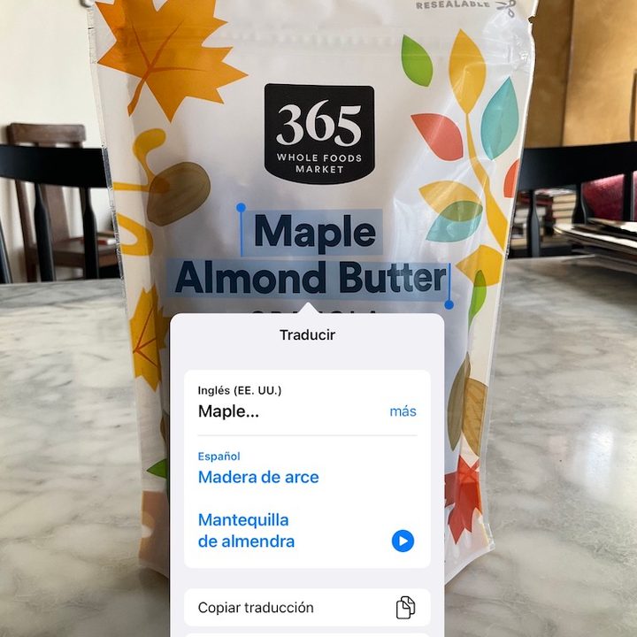 En el sistema operativo iPadOS 15, las nuevas y poderosas funcionalidades de aprendizaje automático incluyen Texto en vivo, que usa la tecnología inteligente del dispositivo para reconocer texto en fotos y darles opciones a los usuarios como traducción a siete idiomas diferentes (español incluido). Y sí, lo traduce todo.
