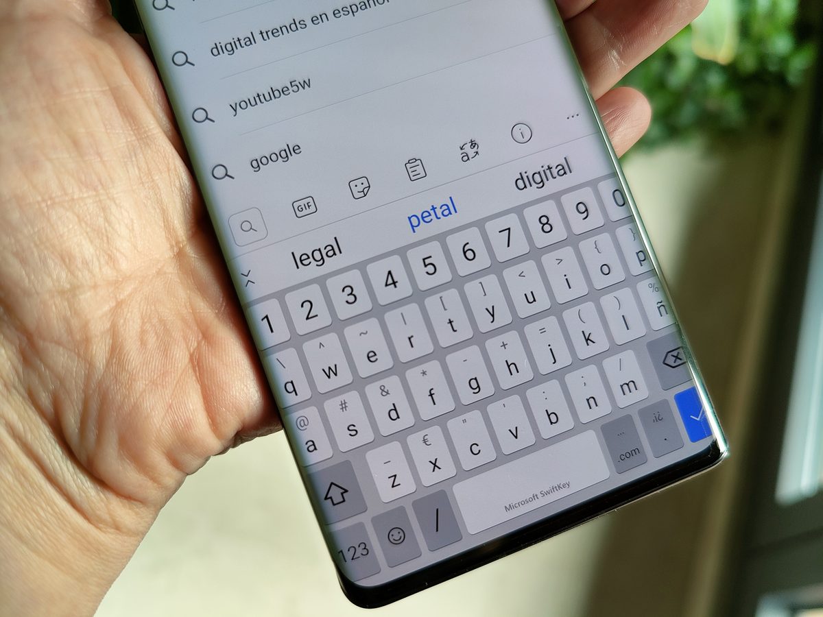 Huawei Mate 40 Pro no es tan estilizado como el Mate 30 Pro. El nuevo modelo es más ancho, largo y grueso (162.9 x 75.5 x 9.1 mm). Aunque las diferencias son de milímetros, se nota bastante a la vista y al agarrarlo. Y también más pesado (212 gramos frente a los 198 del otro). Eso sí, mantiene la pantalla con los laterales muy curvados. Esta inclinación es tan pronunciada que, cuando aparece el teclado para escribir un mensaje, las letras de los costados (q, a, p y ñ) quedan un poco fuera y, por tanto, con menos superficie para pulsar. No obstante, al escribir no debería suponer un problema (al menos para dedos pequeños).