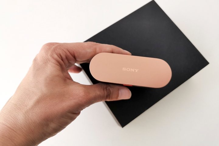 Este modelo se encuadra en la gama alta. Entonces, como te puedes imaginar, la calidad de los materiales salta a la vista, especialmente en el estuche de carga. Los audífonos están fabricados en policarbonato negro completamente, a excepción de un detalle en el micrófono y el nombre de Sony, que son de color cobre. Es un diseño refinado y discreto.