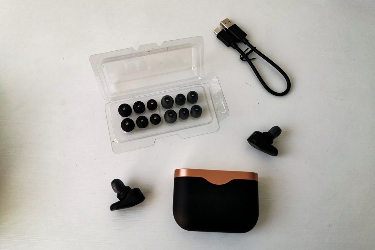 El estuche de color negro mate –de un plástico muy suave– se combina con la tapa de aluminio en color cobre. Esta mezcla queda super elegante, con la pega de que la parte negra se ensucia con facilidad aunque también se limpia fácilmente. El tamaño del estuche es más grande de lo habitual en este tipo de audífonos. Comparado con el de los AirPods, ocupa casi el doble. Esto no tiene por qué ser un problema, al llevarlos en un bolso o una mochila al menos. Tal vez ocupen demasiado en el bolsillo de un pantalón ajustado o de una camisa, esto ya depende de las preferencias de cada usuario.
