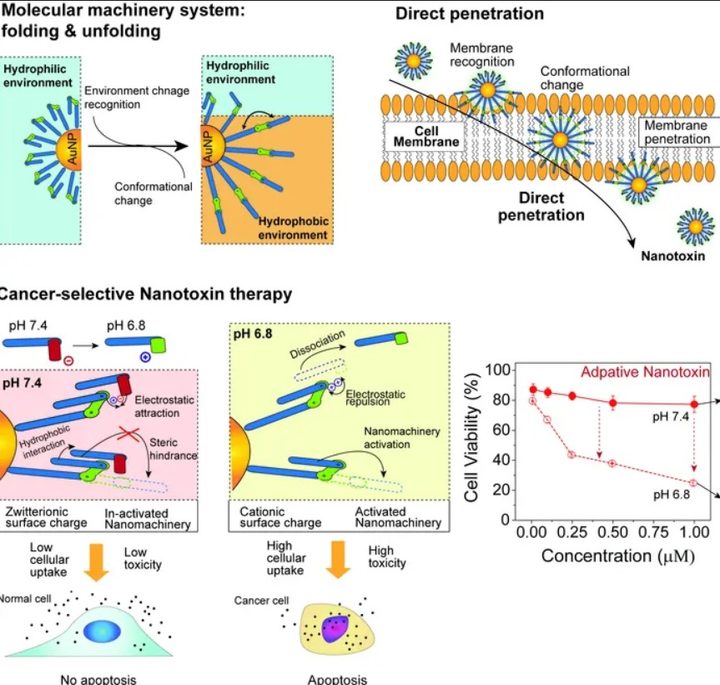 Los científicos coreanos entonces fabricaron una nanomáquina jerárquica sintetizando y combinando nanopartículas de oro de 2 nm de diámetro con moléculas que se pueden plegar y desplegar en función del entorno circundante. Esta nanomáquina estaba compuesta por moléculas orgánicas móviles y nanopartículas inorgánicas para funcionar como grandes estructuras de eje y definía el movimiento y la dirección de tal manera que al llegar a la membrana celular, resultaba en un movimiento mecánico de plegamiento / despliegue que conducía a la nanomáquina a penetrar directamente en la célula, destruyendo los orgánulos e induciendo la apoptosis. Este nuevo método mata directamente las células cancerosas a través de movimientos mecánicos sin medicamentos contra el cáncer, en contraste con los nanoportadores de tipo cápsula que administran medicamentos terapéuticos.