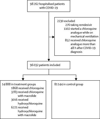 El registro incluía datos de 671 hospitales en seis continentes. Se incluyeron pacientes hospitalizados entre el 20 de diciembre de 2019 y el 14 de abril de 2020, con un resultado de laboratorio positivo para SARS-CoV-2. Los pacientes que recibieron uno de los tratamientos de interés dentro de las 48 h posteriores al diagnóstico se incluyeron en uno de los cuatro grupos de tratamiento (cloroquina sola, cloroquina con un macrólido, hidroxicloroquina sola o hidroxicloroquina con un macrólido), y los pacientes que no recibieron ninguno de estos tratamientos formaron el grupo de control. Se excluyeron los pacientes para quienes uno de los tratamientos de interés se inició más de 48 h después del diagnóstico o mientras estaban en ventilación mecánica, así como los pacientes que recibieron remdesivir.