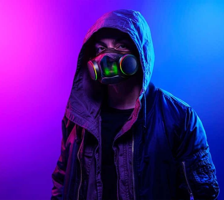 Uno de los elementos que más llama la atención de esta mascarilla es su aspecto futurista, que parece rendir una suerte de homenaje a la estética cyberpunk.