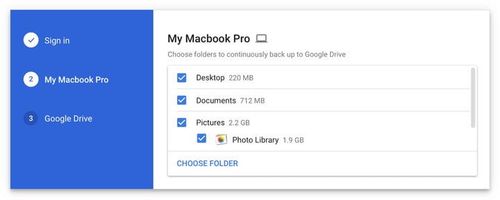 La nueva aplicación realiza una copia de seguridad de archivos y fotos desde tu PC y los almacena en Google Drive y Google Photos. Para utilizarla, simplemente instala la aplicación, selecciona Preferencias y, a continuación, selecciona las carpetas que deseas copiar. Para agregar otras carpetas fuera de las opciones predeterminadas,simplemente presiona Elegir Carpeta.