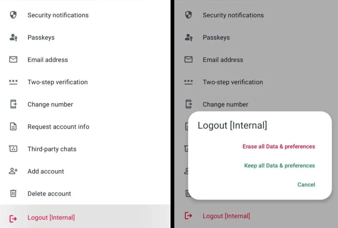 Los ingenieros de Meta están trabajando en una próxima opción de «Cerrar sesión» en la última versión beta de WhatsApp (versión 2.25.17.37). La opción aparece dentro de la configuración de la cuenta de la aplicación. Al tocarlo, se abre una ventana emergente con dos opciones que le permiten cerrar sesión en su WhatsApp con o sin borrar todos los datos y preferencias.