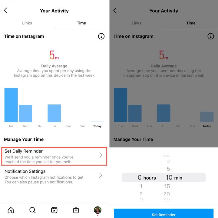 Esta función te recordará que cierres Instagram una vez que hayas usado la red social demasiado en un solo día. Actívala de la siguiente manera:
