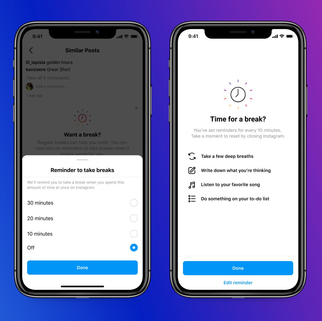 Si mantienes la aplicación abierta durante mucho tiempo sin interrupciones aparecerá tu recordatorio. Este incluso te recomendará algunas ideas de lo que puedes hacer durante tu descanso de la red social, como “respira profundamente”, “escribe lo que estás pensando”, “escucha tu canción favorita” y “haz algo de tu lista de tareas pendientes”.
