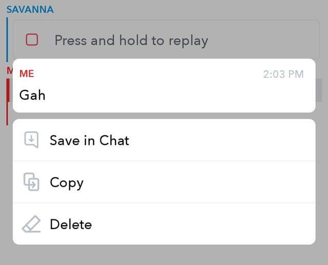 Borrar mensajes, igual que repetir Snaps, es facilísimo. Todo lo que tienes que hacer es poner el dedo sobre el mensaje ofensivo. Entonces aparecerá un menú como el que mostramos aquí. Simplemente toca en Delete y luego Delete Chat. Esto funciona en chats entre dos personas y también en grupales.