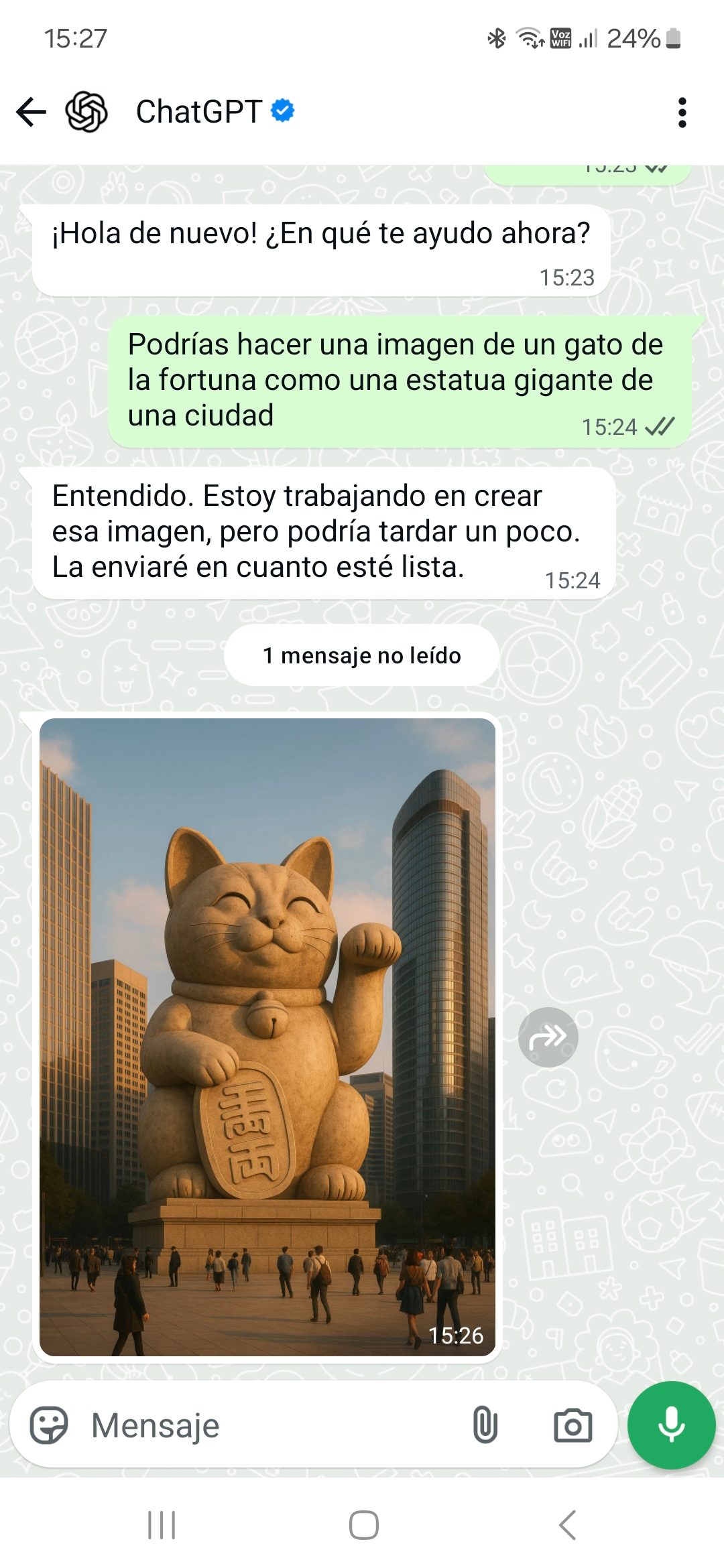 Desde el mes de diciembre de 2024 que ChatGPT está integrado a WhatsApp de una manera muy sencilla, solo se debe agregar el contacto con el siguiente número telefónico: 1-800-242-8478. Una posibilidad muy interesante para interactuar con el chatbot sin necesidad de bajar la aplicación, pero ahora hay una mejor función disponible: la de generar imágenes en la plataforma de mensajería.