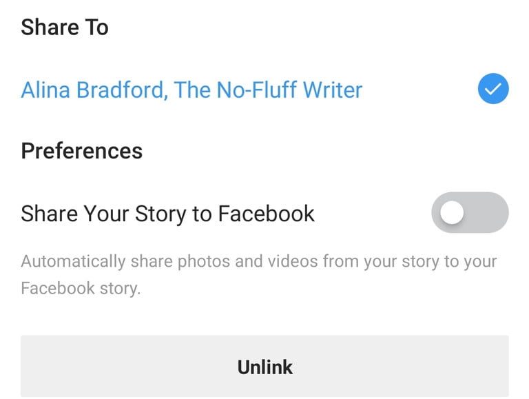 La siguiente página que aparece te brindará algunas opciones adicionales respecto a tu cuenta, como la posibilidad de compartir tus publicaciones e Historias en Facebook de manera automática.