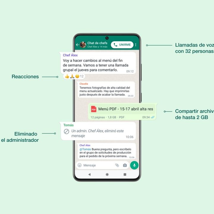 En una posterior actualización, la app de mensajería instantánea especificó sobre cuatro de las herramientas: reacciones, borrado por el administrador, archivos y llamadas.