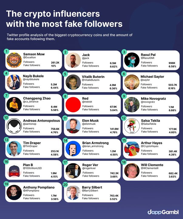 Los datos revelaron que el influencer criptográfico con los seguidores más falsos es Samson Mow, CEO de Pixelmatic o también conocido como @Excellion en Twitter. Tiene más de 260,000 seguidores en la plataforma, aproximadamente el 10 % de los cuales son falsos.