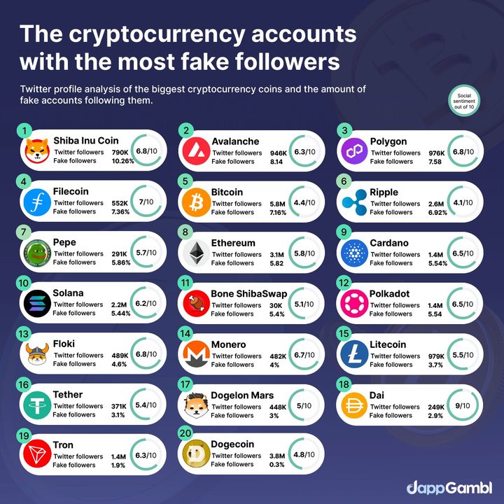 Shiba Inu Coin encabezó la lista con más del 10.26% de sus seguidores siendo falsos, lo que significa que de los 790,000 seguidores de la moneda, más de 80,000 no son personas reales.