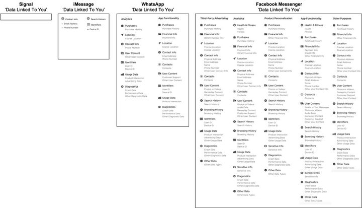 Los dichos de Doffman se sustentan con evidencia. Apenas a inicios de enero, Apple mostró una tabla que muestra los datos recopilados por Facebook en servicios como Messenger y WhatsApp en comparación con plataformas como Signal y iMessage, el mensajero predeterminado del iPhone.