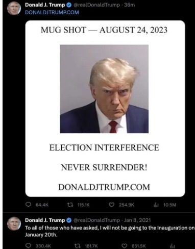 Con el mensaje: “Never Surrender (Rendirse nunca)”, todo se dio en el contexto de cuando este jueves 24 de agosto, el ex presidente se entregó en la cárcel del condado de Fulton por más de una docena de cargos relacionados con sus supuestos esfuerzos para anular los resultados de las elecciones de Georgia de 2020.