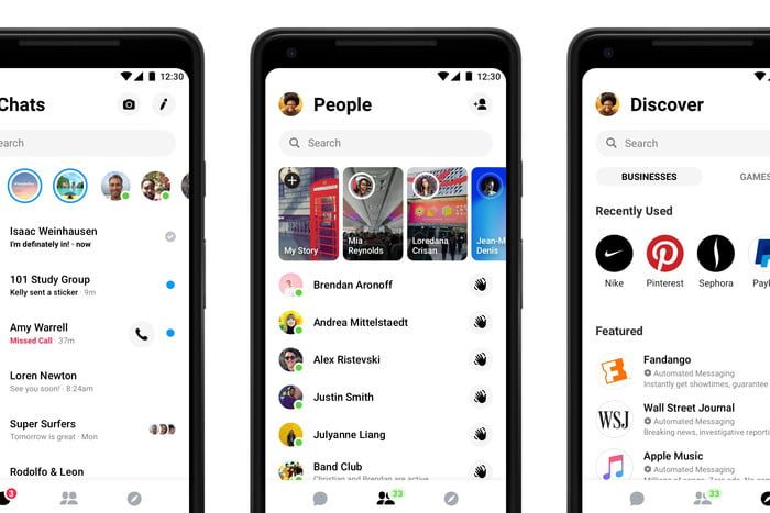 El rediseño simplifica la interfaz de usuario, al tiempo que introduce nuevas opciones de personalización. Después de actualizar la aplicación, los usuarios de Messenger notarán primero una pantalla menos abarrotada: en lugar de cinco íconos de acceso directo en la parte inferior, ahora solo hay tres. Dentro de la página de chat, los mensajes ya no se dividen en pestañas que separan los mensajes de llamadas de los chats individuales o grupales, sino que ahora existen tres categorías principales de navegación: Chat, People y Discover.