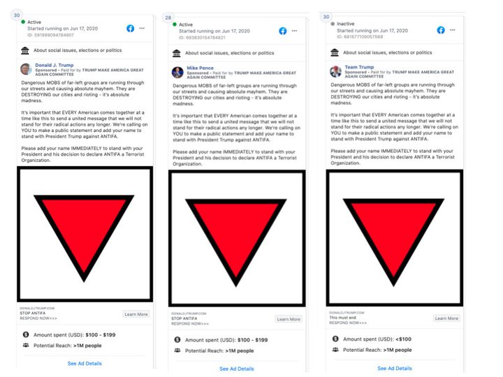 Desde el 3 de junio, el equipo de marketing del actual presidente ha estado publicando anuncios en la red social sobre el movimiento de izquierda antifascista “Antifa”. El 17 de junio, la campaña agregó un triángulo rojo invertido a algunas variaciones del anuncio, un símbolo que los nazis usaron para designar prisioneros políticos.
