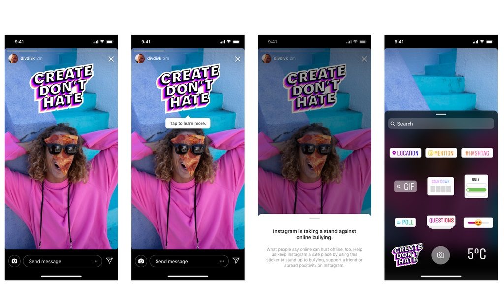 Otra de las medidas anunciadas por Instagram, que forman parte de las acciones del Mes Nacional de la Prevención del Bullying en los Estados Unidos, es la creación de la pegatina Create, Don’t Hate (Crea, no odies, en español) que se puede incluir en las historias. Además, próximamente lanzará una etiqueta mundial anti-bullying, inspirada en el trabajo que llevarán a cabo con niños y adolescentes.