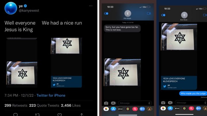 “Ye” como se hace llamar ahora, publicó una esvástica diseñada para parecerse a una estrella de David y compartir mensajes de texto personales que el rapero tenía con el propietario de Twitter, Elon Musk. No está claro de inmediato si West fue realmente prohibido por la esvástica o por compartir públicamente sus textos de Musk, quien compró Twitter por $ 44 mil millones en octubre.