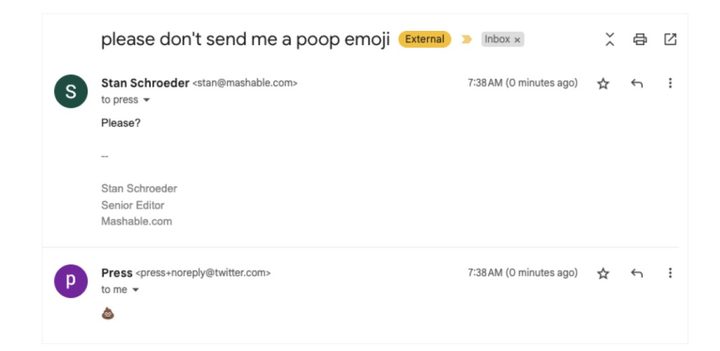 Posiblemente a nadie le agradaría que un correo electrónico escrito a un remitente sea respondido con un emoji de caca, y eso es justamente lo que está pasando con el mail de prensa de Twitter.