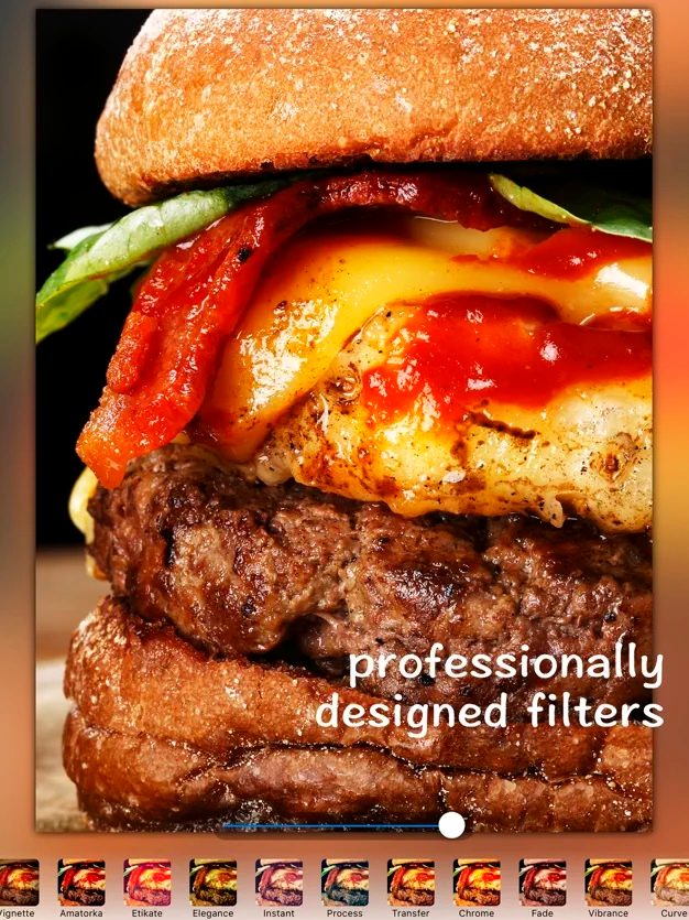 Food Photo Editor es otra aplicación específica para capturar lo mejor de tus alimentos, pero que se caracteriza por la particularidad de ofrecer filtros y herramientas de diseño profesional de un solo toque, ideales para capturar lo mejor de tus alimentos. En no más de un paso, también puedes editar, retocar y redimensionar tus imágenes para que se adapten a cualquier plataforma. Aunque es una aplicación gratuita para usuarios de iPad, si quieres eliminar los avisos deberás pagar $1 dólar.