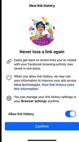 La compañía presenta el historial de enlaces como una herramienta útil para los consumidores “con su actividad de navegación guardada en un solo lugar”, en lugar de otra forma de controlar su comportamiento. Con la nueva configuración, “nunca volverás a perder un enlace”, dice Facebook en una ventana emergente que alienta a los usuarios a dar su consentimiento al nuevo método de seguimiento. La compañía continúa mencionando que “cuando permites el historial de enlaces, podemos usar tu información para mejorar tus anuncios en las tecnologías de Meta”.