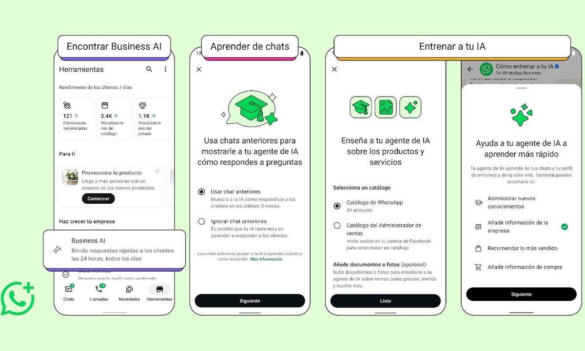 Los negocios podrán personalizar la configuración de los agentes de IA en WhatsApp Business, seleccionando qué datos de su empresa -como los productos que muestra en su catálogo o información de su página web- puede usar el asistente para construir las respuestas a clientes, y en qué horario puede responder preguntas. Los comerciantes también podrán determinar cuándo una conversación de la IA con el cliente debe pasar a una persona del equipo para atender dudas más complejas o específicas.