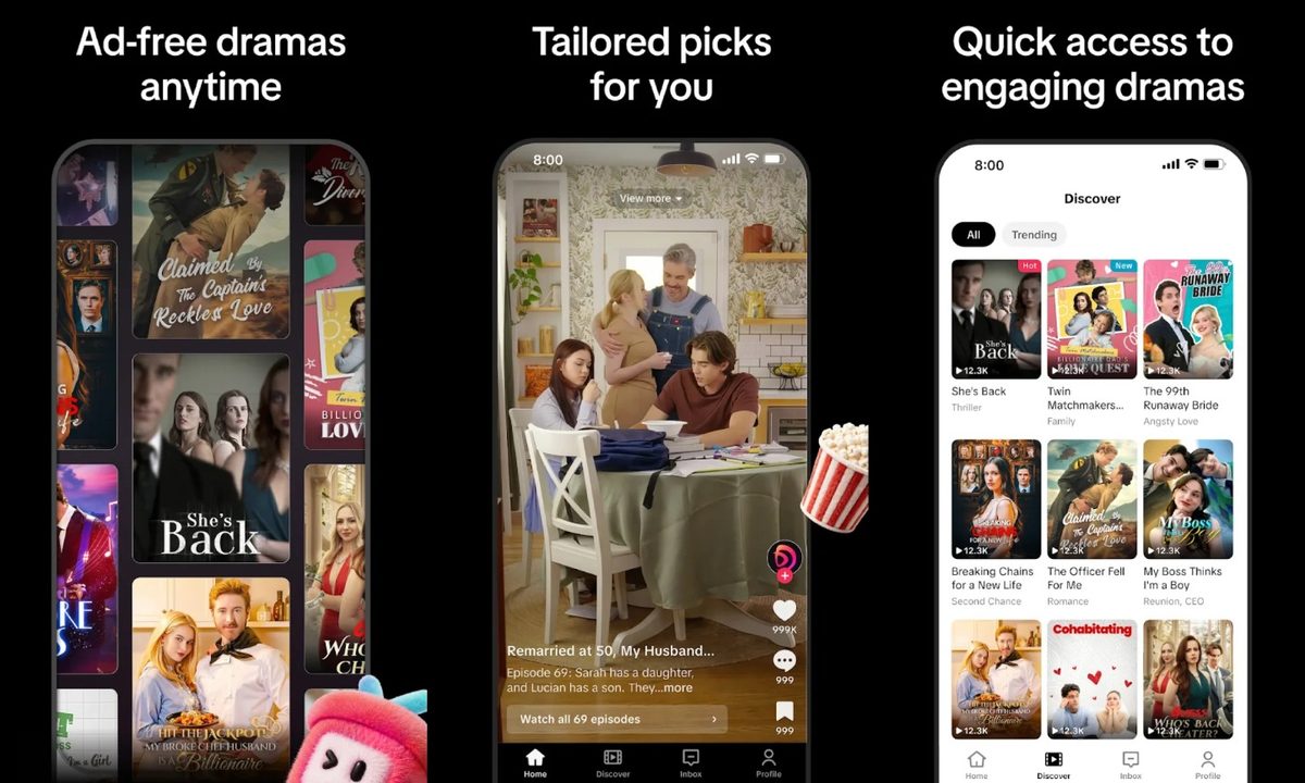 Según Business Insider, la app cuenta con una pestaña «Descubrir» donde los usuarios pueden encontrar nuevos dramas desplazando verticalmente las recomendaciones o filtrando los resultados según lo que esté en tendencia. Abarca una variedad de géneros, incluyendo thriller, romance y dramas familiares, con títulos populares como «Love at First Bite» y «The Officer Fell for Me.»