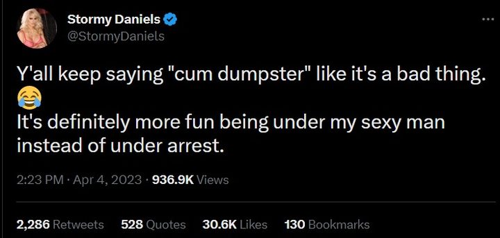 Y este martes 4 de abril, mientras el ex presidente negaba 34 cargos en contra por falsificar delitos comerciales en relación a la acusación de la ex pornstar, Daniels tuiteaba alegrándose por el momento: