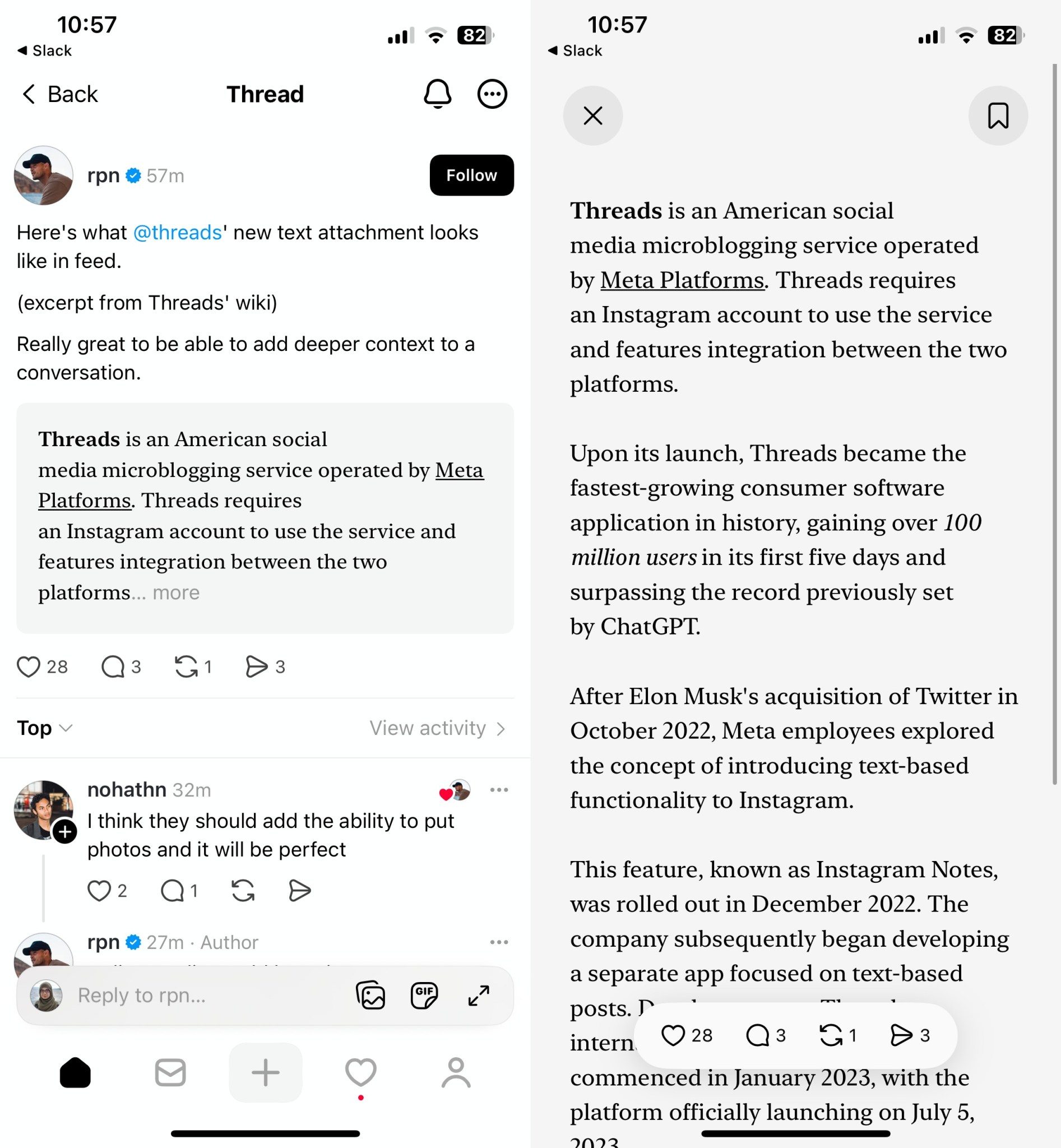 El investigador de aplicaciones Radu Oncescu vio por primera vez la nueva función de «archivo adjunto de texto» en iOS y compartió una captura de pantalla de la misma. Según la descripción de la aplicación de la nueva función, está diseñada para permitir a los usuarios «adjuntar texto más largo y ser creativos con herramientas de estilo para compartir pensamientos más profundos, fragmentos de noticias, extractos de libros y más».