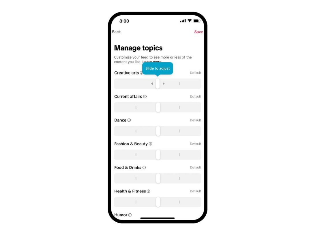 En Preferencias de contenido > Administrar temas (que se pueden encontrar en “Configuración y privacidad”), los usuarios pueden ajustar los controles deslizantes para indicar que quieren más o menos de ciertos temas en su página Para ti. Los temas incluyen “artes creativas”, “temas de actualidad”, “humor” y más. Los controles deslizantes se establecen en un punto medio predeterminado al principio, y los usuarios pueden modificarlo desde allí.