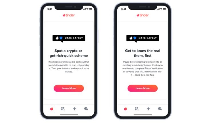 Tinder y la aplicación francesa de citas en línea Meetic pedirán a los usuarios mensajes en la aplicación con consejos y comportamientos comunes a tener en cuenta. Las sugerencias incluyen asegurarse de que las posibles coincidencias tengan su foto de perfil verificada, chatear por video con ellos antes de reunirse en persona y aprender a reconocer las banderas rojas de los estafadores.