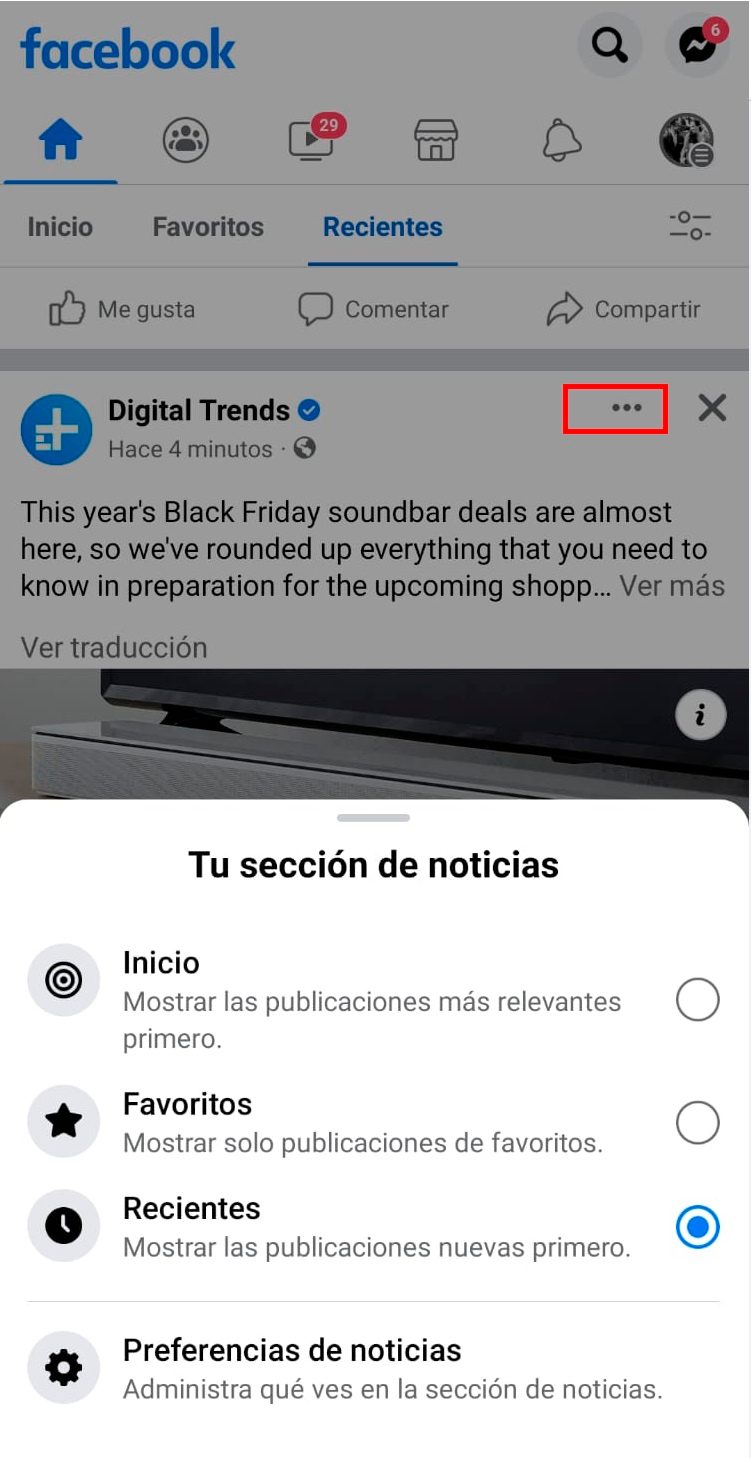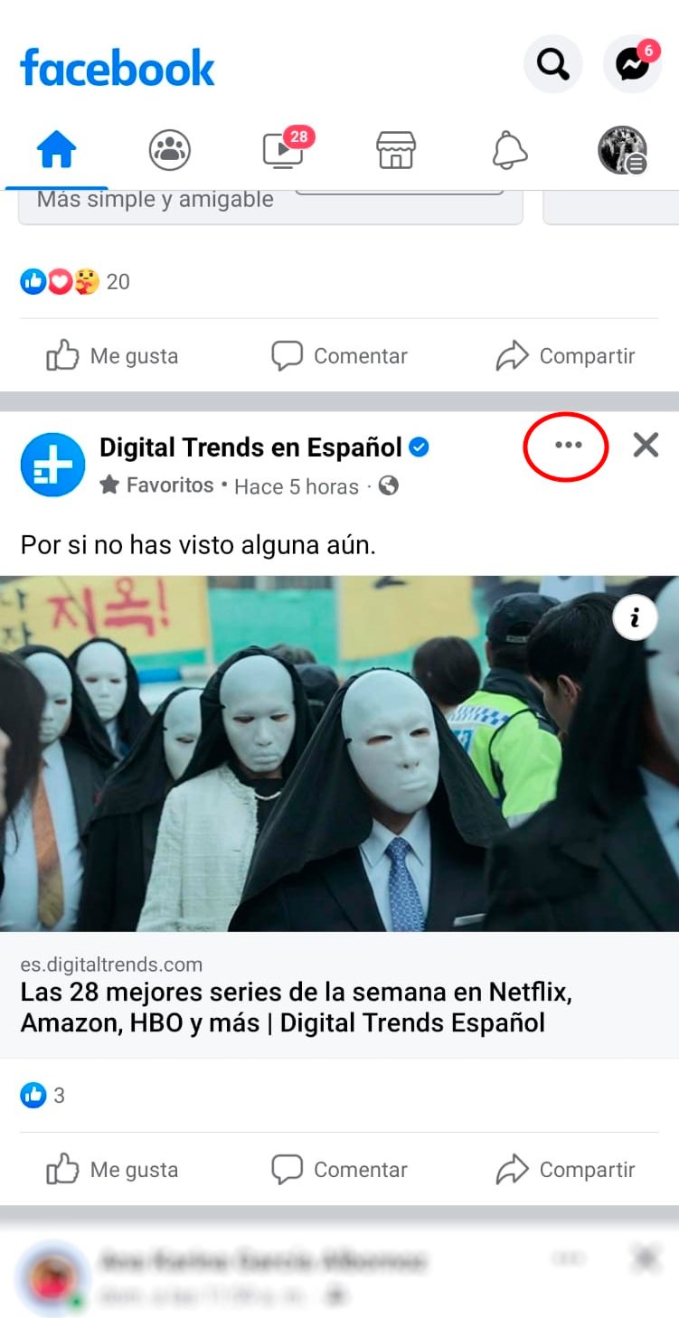 - Presiona los tres puntos suspensivos en la parte superior derecha de la publicación en la sección de noticias.