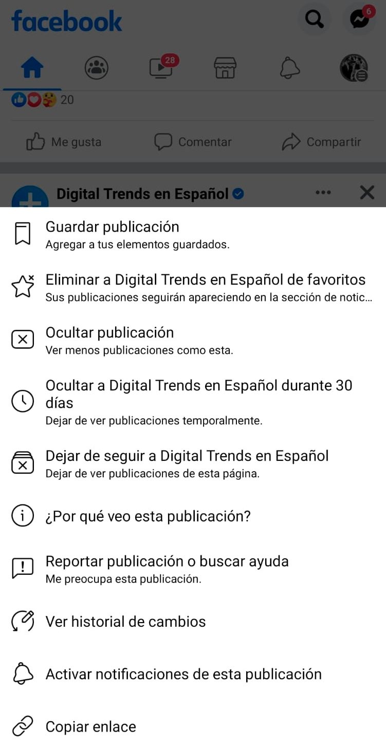 Desde un teléfono inteligente puedes hacerlo de la sección de noticias de forma individual. De esta forma, cuando veas una publicación que quieras ajustar, debes realizar los siguientes pasos: