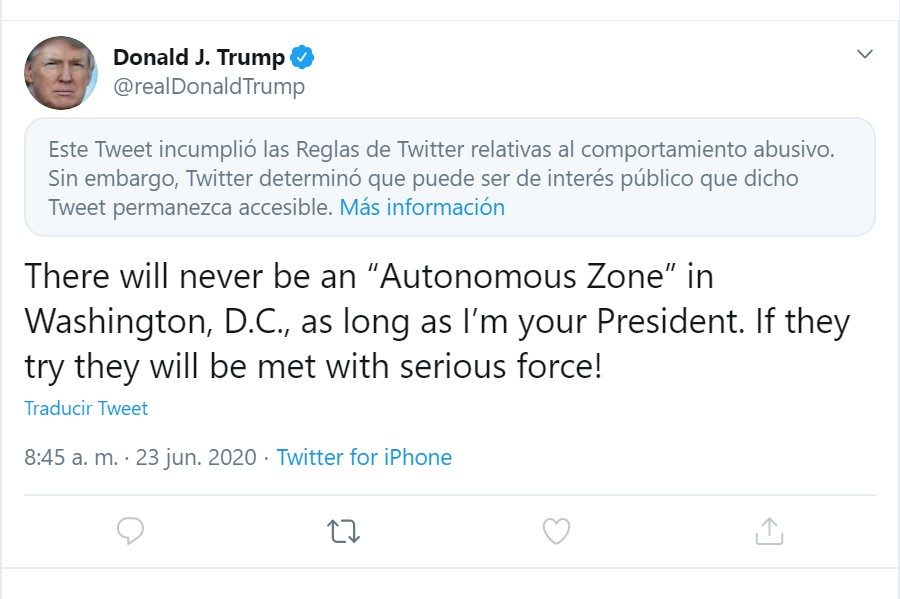 En dicho tuit, el gobernante advertía que “nunca habrá una ‘zona autónoma’ en Washington DC” mientras ocupe la primera magistratura”.