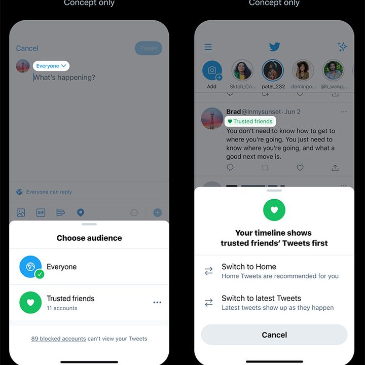 - Una nueva función llamada Amigos de Confianza, que consiste en elegir previamente a un grupo selecto de personas y generar tuits que solo esa gente pueda leer e interactuar, lo que daría paso a una conversación privada. Estos grupos podrían crearse por interés genuino de amistad, por geolocalización e incluso por compartir algún interés en común.