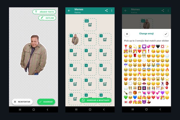 En esta parte, también puedes cambiar los emojis que coinciden con los stickers del paquete. Para ello, selecciona un sticker, toca Change emoji y escoge tres emojis del listado para asociarlos. Luego, puedes usar estos emojis para buscar tus stickers en WhatsApp.