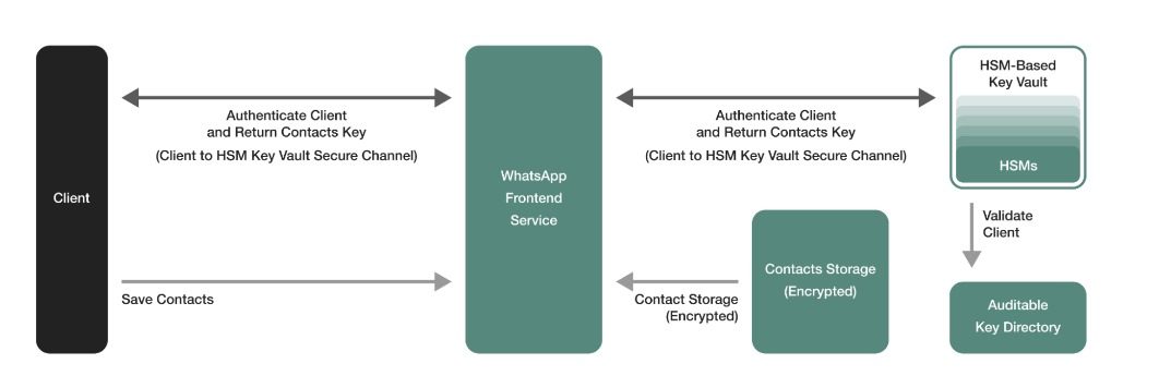 Los nombres de los contactos se almacenan encriptados dentro de WhatsApp, con protecciones adicionales y sólidas mediante el uso de IPLS para disuadir el acceso a los contactos a cualquier persona, excepto al usuario.
