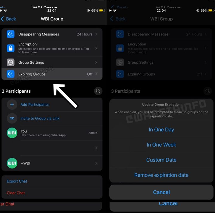 “WhatsApp ahora está trabajando en una nueva función llamada “Grupos que expiran” que permitirá a los usuarios establecer una cierta fecha de vencimiento para sus grupos, para una futura actualización de la aplicación. Una vez que se alcance la fecha de vencimiento, se pedirá a los usuarios que limpien el grupo”, sostiene la publicación.