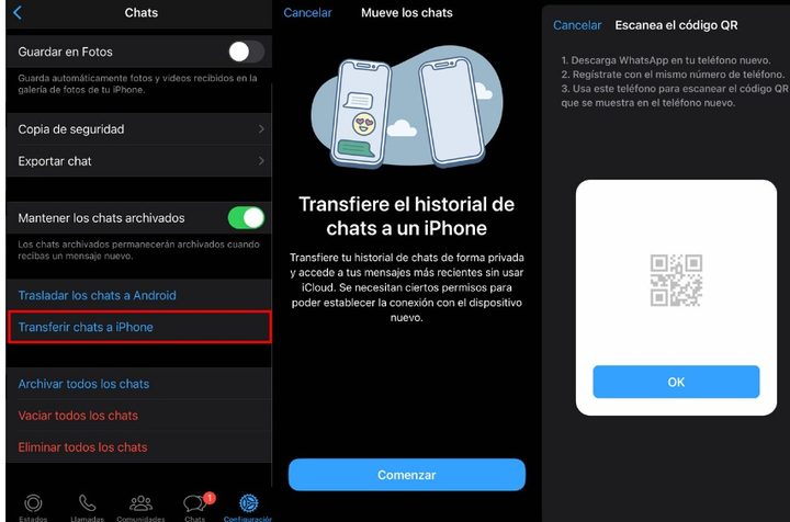 - Abre WhatsApp y ve a Configuración/Ajustes > Chats > Transferir chats a (aquí aparecerá tu móvil, ya sea Android o iPhone). En el paso siguiente, pulsa en Comenzar, después en OK y otorga los permisos necesarios.