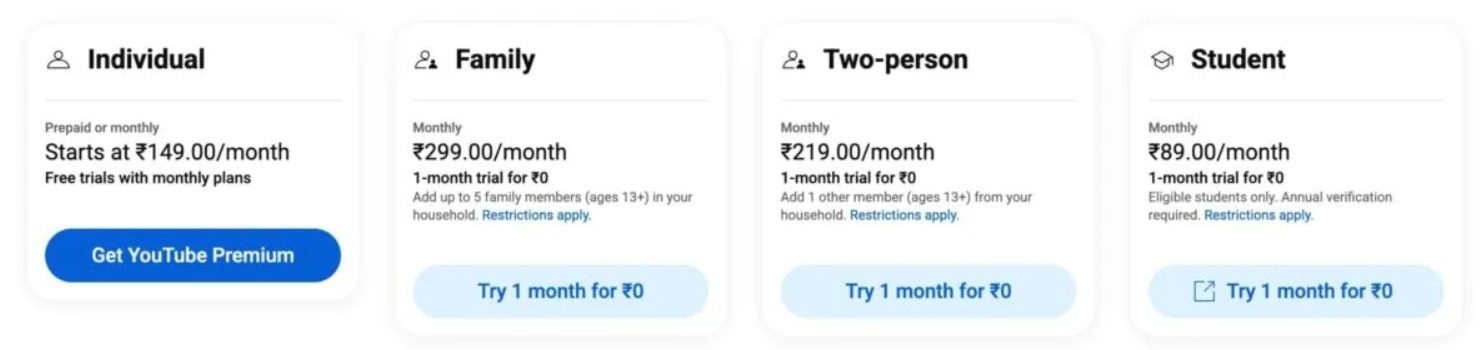 En India, el nivel de suscripción de YouTube Premium para dos personas se ofrece por Rs. 219 (~$2.60) por mes, mientras que la suscripción compartida de YouTube Premium Music se ofrece por Rs. 149 (~$1.77) por mes. Tenga en cuenta que India tiene algunos de los precios de YouTube Premium más baratos del mundo. Si el programa piloto se extiende a otras regiones, puede esperar que los precios para dos personas se alineen con sus planes de tarifa actuales.