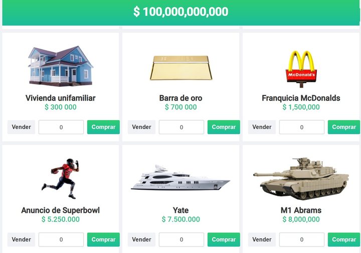 El juego enumera un montón de artículos junto con sus precios que Bill (tú) puede comprar. Tiene la opción de comprar una botella de vino de lujo ($7,000 dólares), un libro ($15 dólares), un Tesla ($75,000 dólares) y un crucero completo ($930,000,000 dólares).
