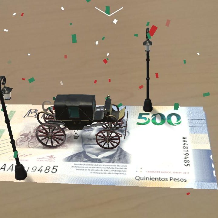 Si echamos un vistazo al de $500 pesos encontraremos una carroza en pleno paseo triunfal que presuntamente transporta a Benito Juárez entre aplausos, vítores y hasta confeti. Juárez fue presidente entre 1858 y 1872, y es un personaje sobresaliente en la historia del país. Al otro lado, en un interesante contraste, unas ballenas nadan apaciblemente en un océano virtual.