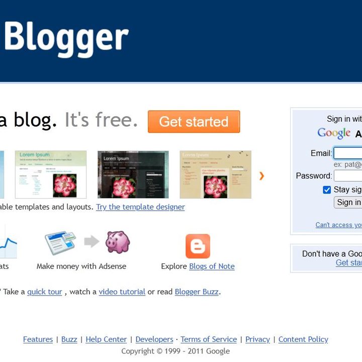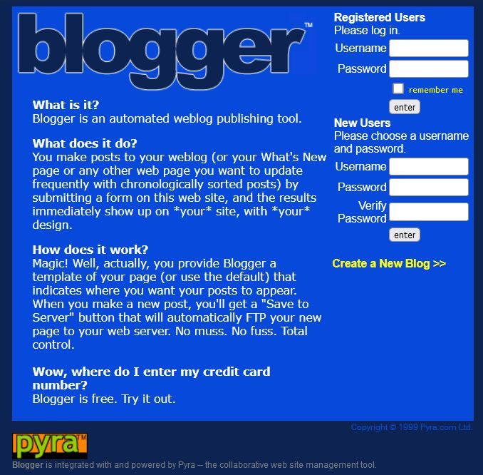 La primera versión de Blogger explicaba en su portada de forma clara y precisa la utilidad de la plataforma. “Blogger es una herramienta automatizada para publicar weblogs”, de acuerdo al sitio. La descripción también usaba la palabra “magia” para explicar cómo la publicación de un nuevo artículo aparecía de inmediato en el sitio sin mayores complicaciones.